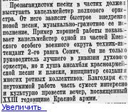 В училище выявились прекрасные запевалы — тт. Поплавец и Немилов, Вместе с капельмейстером Грунес, политруком Скородумовым, курсантом Буцким они организуют спевки в подразделениях.